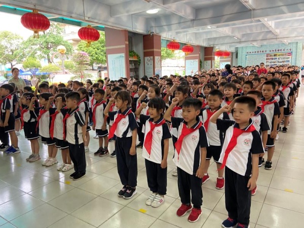 鲜红的队旗迎风飘扬,嘹亮的少年先锋队队歌响彻校园,2020年6月10日下午,横栏镇三沙小学在学校教学楼一楼架空层举行了主题为“红色基因代代传,争做最美三小人”的一年级新生入队仪式。