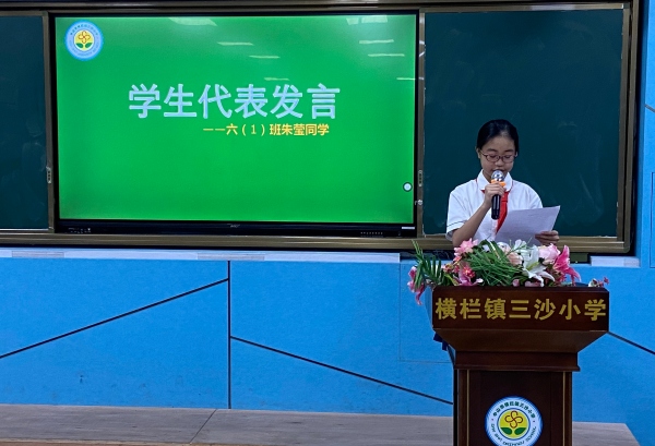接下来,由学生代表六(1)班朱莹同学、数学科组长黄丽萍老师、德育处张爱玲主任分别进行发言。朱莹同学带领同学们回顾了全国各地遭遇新冠肺炎肆虐的艰难时刻,感恩每一位处在防疫一线的人民英雄。黄丽萍科组长总结了前段时间学生线上学习的情况,并对返校后的学习提出四点要求:调整学习状态,端正学习态度,掌握学习方法,拥有强健的体魄和良好的心理素质。张爱玲主任则与同学们分享了激励向上的成长宣言,并提醒同学们树立安全意识,注意防范各种危险,保护好自身安全。