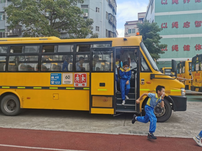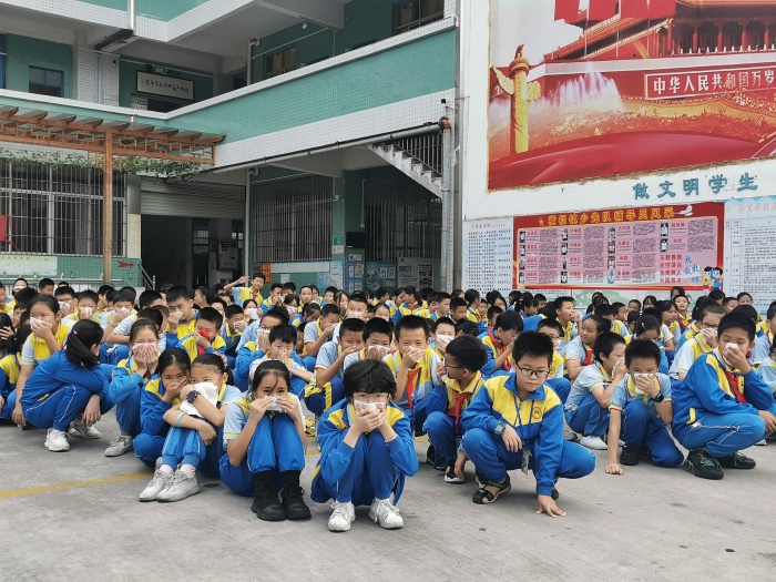 9时整,随着一阵尖锐而又急促的火警警报声响起,各班在班主任或科任老师指挥下,紧急进入警备状态。孩子们迅速排好队,从教室往楼梯口撤退。他们紧贴着墙壁或楼梯栏杆,右手用毛巾捂住口鼻,弯腰、有序、安全地向前小跑,全校师生毫不慌乱,安排人员各自尽职守护岗位,指挥并搜索有无未撤出的孩子。全校2700余师生在4分钟之内按预定的疏散路线安全撤离到指定地点。接着,学校还模拟了校车突发火灾后的应急逃生演练,校车上的同学在跟车老师的指挥下安全、有序、快速地撤离到安全地方等候进一步处理。