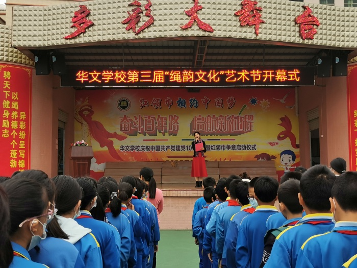 红色三月,中国梦的精神呼唤华文人脚踏实地地前行;激情三月,华文校园荡漾着华文人对艺术的憧憬与追求。为庆祝党的百岁生辰,传承党的光荣传统和优良精神,繁荣校园文化、倡导精神文明、塑造优良品格、陶冶高尚情操,让同学们崇尚文化、热爱艺术、热爱人生,华文学校于3月22日上午举行庆祝建党百年暨第三届“绳韵文化”艺术节开幕式。本次活动由德育处荀丹副主任主持。