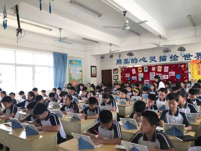 首先是语、数、英三科的智慧课堂展示:胡玲玉老师在四(4)班教室上了一节语文课《为人民服务》,梁坤志主任在录播室上了一节数学课《平移》,吴金玲老师在五(2)班教室上了一节英语课《Unit3 On Vacation》。三位老师在课堂中充分运用了智慧课堂的大数据统计和作业提交功能,及时了解学生的学习达成度,并借助智慧课堂的互评功能让同学们可以互相学习、互相纠正,让学生在相互学习中通过思与辩的方式更好地掌握所学的知识,真正让学生“站在中央智慧生长”。智慧课堂系统功能的运用,大大提高了课堂效率。