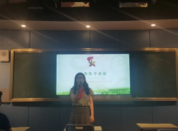会议开始,与会师生齐唱《中国少年先锋队队歌》,少先队员行队礼。大队长冯紫雯对上学期少先队干部工作做总结发言。