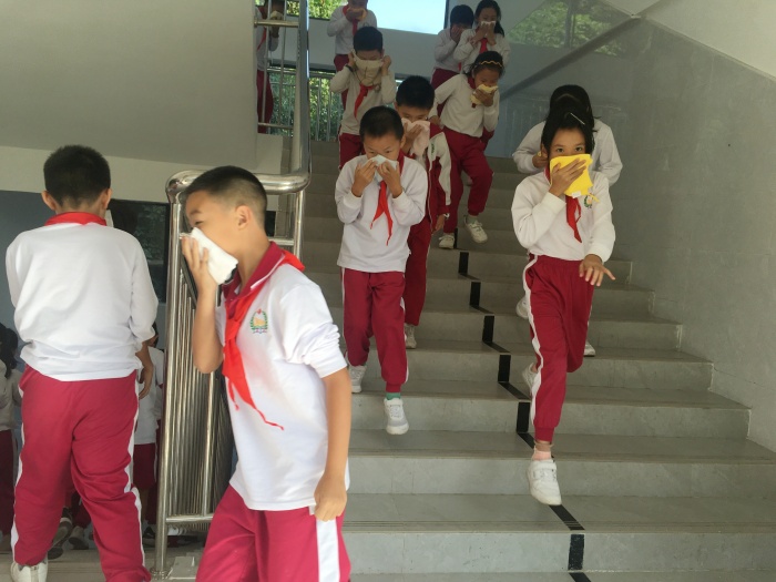 为了实施好这次演练,学校制定了详细的消防疏散演练方案,对各班逃离的路线及安全出口老师的职责等内容都做了明确的规定。演练开始前,各班级预先进行了演习布置工作,班主任对学生做了详尽的演习讲解。16:00随着警报的响起,各班主任老师迅速组织学生疏散,其他老师们也在第一时间赶到自己当时所在楼层拐角处配合疏散学生。学生在老师们的指挥下,按照演练方案中规定的路线,弯着腰,猫着步,用毛巾捂住口鼻,沿着学校指定楼梯口快速前进,有序撤离到学校操场的安全地带集合。经计时,从警报响起到全体师生从课室疏散、集合完毕,共计用时不到2分钟。