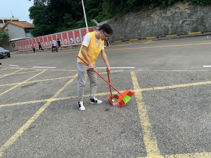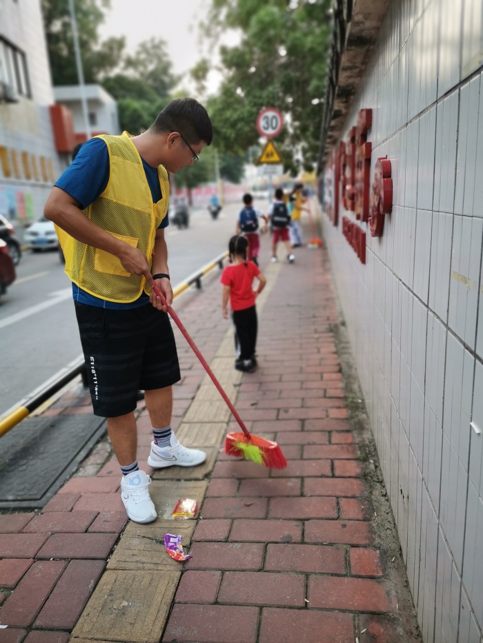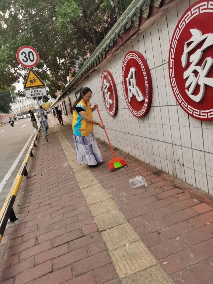 此次卫生清洁活动分三个地点开展:地点一从校园东门的校门门口;地点二从校园南门门口;地点三从校园东门到南门围墙外。党员带上工具在校园内、校外周边工作,将清理卫生死角作为此次系列活动的第一站。对学校东南门的门口两边的树叶和泥沙进行清理,把校园外的一条街道打扫干净。在清洁过程中,党员志愿者们在校园外面有的清扫路面纸屑、烟头等废弃物及枯枝落叶;有的用铲子等工具清除街边砖缝的烟头、饮料吸杯等杂物,努力清除卫生死角;有的擦拭校外的宣传栏灰尘。大家热情高涨、挥汗如雨,以劳动为荣、以付出为乐,发扬了不怕苦、不怕累、不怕脏的奉献精神,以实际行动为国庆贡献一份力量。 经过党员志愿者们的同心协力,校园内外被打扫的干干净净,整体面貌焕然一新。