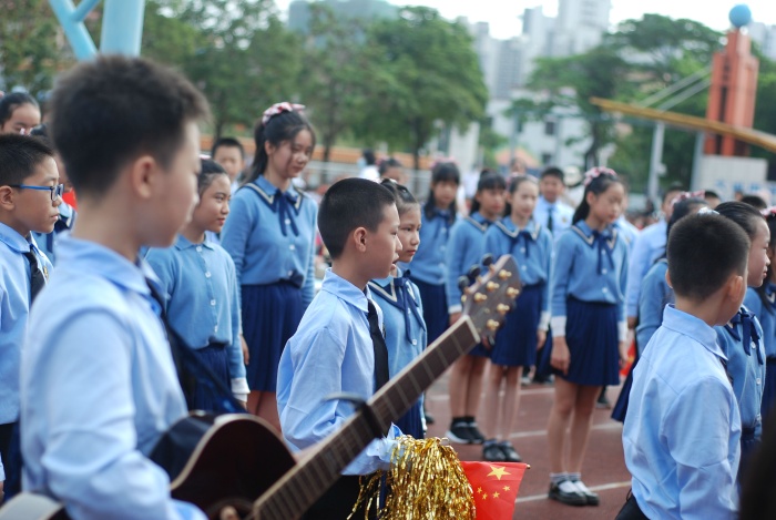 入场式结束,雄壮的国歌声响起,庄严的五星红旗和校旗飘扬在运动场上空。