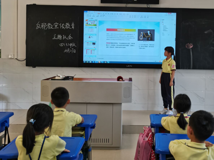 10月27日下午的班会课上,班主任借助图片给学生详细地讲解如何分辨什么是邪教;还组织学生观看反邪教宣传教育片,通过一个个鲜活的事例,使学生对邪教有了深刻的认识,了解了宗教与邪教的区别,知道邪教给国家、社会和个人带来的危害,当遇到宣传邪教的人时的正确应对方法,让孩子知道珍爱生命,远离邪教。