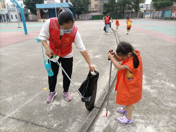 活动得到三小亲子义工队家长们的大力支持,活动召集一发出,10分钟报满了名。活动中,志愿者们个个干劲十足,不怕脏,不怕累:你拿袋子,我捡垃圾,配合得相当默契;有的用大扫把,将校园里满地的树叶扫在一起;有的拿着钳子,穿梭在路边花坛中,将那深藏其中的脏物一个不漏地“揪”了出来;有的干脆直接用手捡拾起垃圾……