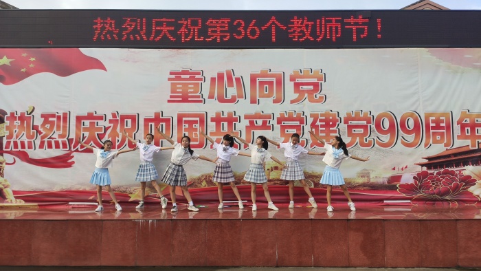 2020年9月10日上午,开发区第三小学一场简短而又富有深意的教师节庆祝活动拉开帷幕。过去一年里,在老师们的努力下开发区第三小学的教学质量得到很大的提升,涌现出一批教学质量先进骨干教师。借此节日,三小表彰了这一批优秀的教育工作者,三小唐秉晶校长和陈平副校长为他们颁发了奖状。表彰仪式结束后,少先队员们奉上了精彩的表演节目。由二(1)中队队员表演的一首手语舞《听我说,谢谢你》,一双双灵巧的小手配合着音乐的节奏通过手语动作去描述着想说的话“谢谢你,老师们,你们真的辛苦了!” 勾起了大家对恩师的体贴、心疼、劝慰、感恩、祝愿等等美好的感情。四(4)中队队员们演唱“每当我走过老师窗前”这首耳熟能详的歌曲,清脆的童声在大操场响起,全校师生洋溢着愉快的心情沉醉在歌声中。演唱结束,台上的队员一起用响亮的声音祝福老师们。最后一个节目是由六(3)中队表演的舞蹈“向快乐出发”,台上的队员热情四射,卖力演出,她们用青春活力向老师致敬,赢得了全场师生的热烈掌声,庆祝活动达到了高潮。