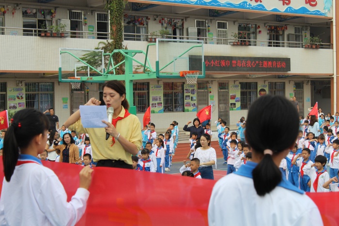活动在庄严的国歌声中拉开序幕。五(4)中队的翁俊宇同学用列数据和具体案例向全体师生介绍目前毒品对青少年的危害情况,并指出当前队员们正处于生理和心理的成长期和突变期,容易在空虚无聊、情绪低落、遇到挫折的时候受到毒品的侵害,呼吁全体师生要认清毒品的危害,自觉主动拒绝毒品,不以好奇心为由侥幸尝试。同时,要树立正确的人生观,不盲目追求享受,寻求刺激,赶时髦、攀比,增强抵抗力。随后,全体师生在学校大队辅导员阮结连的带领下宣誓:珍惜美好年华,从我做起,从现在做起,从杜绝吸烟做起,终身远离毒品、拒绝毒品。各中队代表在“健康人生,绿色无毒”横幅上签名,表决心——珍爱生命,远离毒品。