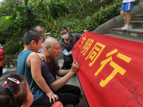 活动当天,第五小学亲子义工队的志愿者们顶着高温,早早来到了活动现场。活动伊始,亲子义工队负责人阮结连老师就本次活动的意义、活动安排、活动注意事项等事宜进行讲解,对小队员们进行创文知识的宣传培训。准备工作就绪后,亲子义工队的小队员们在爸爸妈妈的带领下对公园内的群众开展创文宣传、普及文明创建知识,旨在提高市民群众对创文的参与率、知晓率。虽然亲子义工队的队员们年纪小小,但却表现出创文小主人翁的意识,主动向群众普及创文知识。群众自觉在横幅上签署名字,承诺做文明的火炬人,为创建文明城市出一份力量。在宣传活动的同时,成员们还“小手拉大手”对公园内外卫生死角进行垃圾清除。虽然天气炎热,却丝毫没有阻挡第五小学亲子队成员们的热情,他们身体力行积极参与创文工作,建设美丽火炬区。