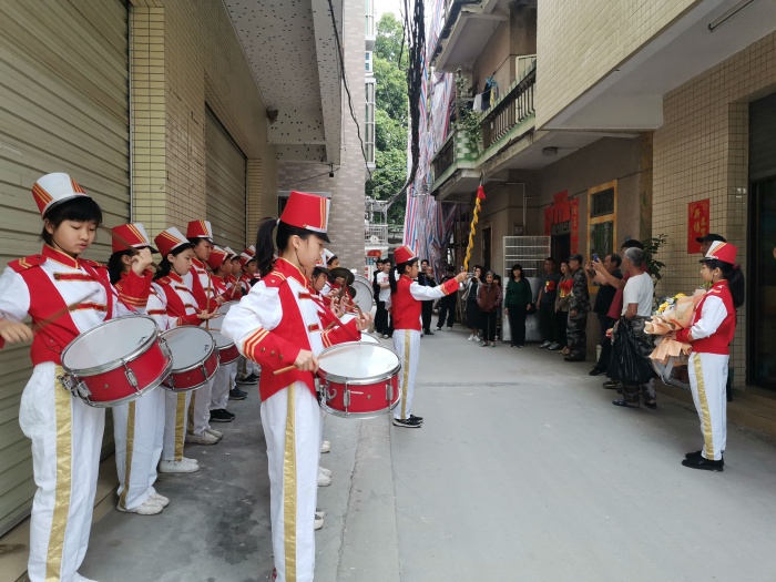 3月13日上午,火炬区第五小学的少先队鼓号队应社区邀请参加入伍新兵欢送活动。在郑倩喜等老师的带领下,参加了黎村小区的新兵入伍欢送仪式。