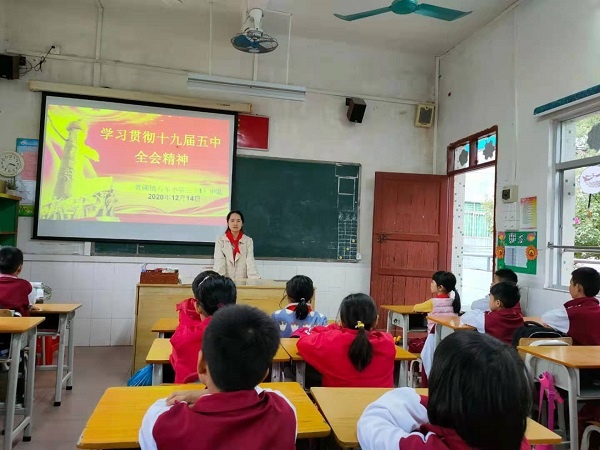 为深入学习贯彻习近平总书记在党的十九届五中全会重要讲话精神和全会精神,以及总书记出席深圳经济特区建立40周年庆祝大会和视察广东重要讲话、重要指示精神,聚焦培养担当民族复兴大任和时代新人,根据《广东共青团学习宣讲贯彻党的十九届五中全会精神方案》《关于开展广东省中小学“灯塔工程·广东学子宣讲党的十九届五中全会精神”实践活动的通知》和《“灯塔工程”·广东学子宣讲党的十九届五中全会精神实践活动指引》要求,2020年12月14日,黄圃镇石军小学少工委开展宣讲党的十九届五中全会精神活动。