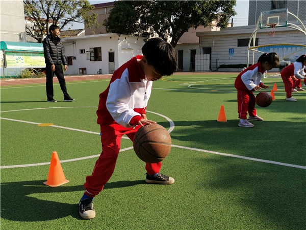 拍球比赛。一二年级的学生别看他们幼小,模样看起来却是有范。他们一边拍球,一边为自己打气,尽管中途球被“打偏”了,但立马就捡起来继续拍打,认真比赛的样子甚是可爱。
