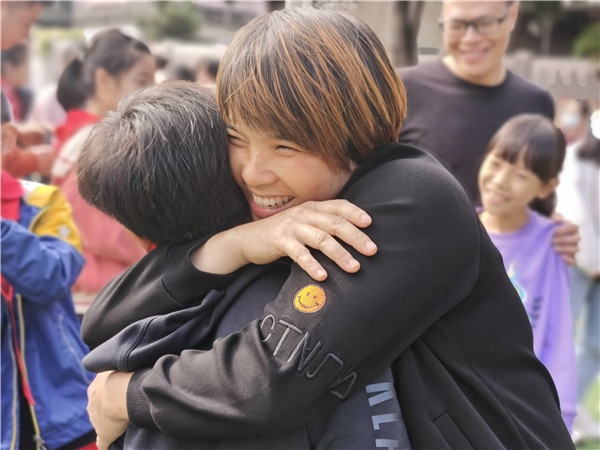 最后是亲子互换体验“你是我的眼”,在成长过程中,总是父母牵引着孩子们前进,如今学生与家长角色对调,家长蒙着眼睛被孩子牵引着,一步一个脚印地前进,跨越前方的障碍,这都需要孩子与父母之间的相互信任。最后到达终点的拥抱,更是让学生与家长感受到彼此之间的爱。