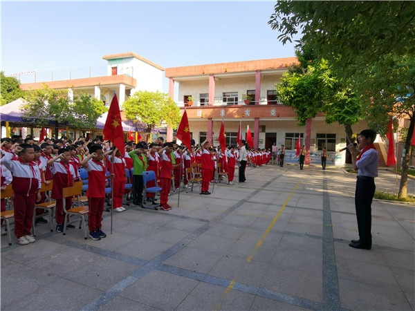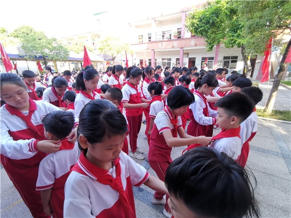 队歌唱罢,大队辅导员梁老师宣读新队员入队名单后,新队员在四位辅导员的带领下有序进场,五六年级的老队员代表们为新队员们戴上了鲜艳的红领巾。这一刻,新队员的心中仿佛都浪涛翻滚,感到无比神圣和自豪。是的,红领巾是光荣的代表,戴上红领巾,心中就有了信念,有了希望,有了前行的方向和力量。紧接着,由大队辅导员带领新队员在队旗下宣誓,洪亮的宣誓声久久回荡在校园的上空。