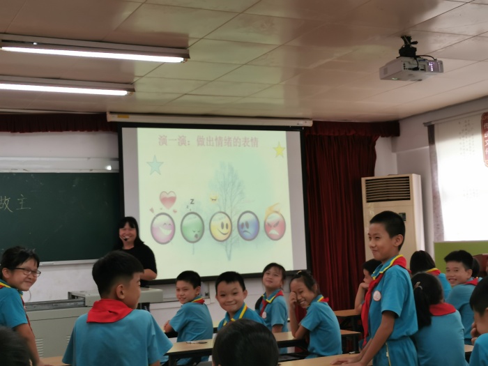 课堂上,黄老师首先通过做游戏的方式,活跃课堂气氛,然后再让学生猜关于情绪的谜语。接着让学生表演不同的情绪,让学生学会了不同情绪的表情。接着黄老师讲述了一个关于下雨的故事,让孩子体验同样是下雨的天气,不同的人对于同一天气不同的内心感受。接着黄老师和学生一起来模仿表情,让学生学会用表情来表达情绪,同时还引导学生可以把不良的情绪说出来、写出来等。随后黄老师和同学们一起学习了控制情绪的方法,有转移注意力、合理发泄情绪、自我暗示、自我嘲讽等方法。最后,黄老师还让同学们把不开心、不快乐的事情写在纸条上,并折成飞机,放飞到指定的纸箱里面,宣泄心理情绪。