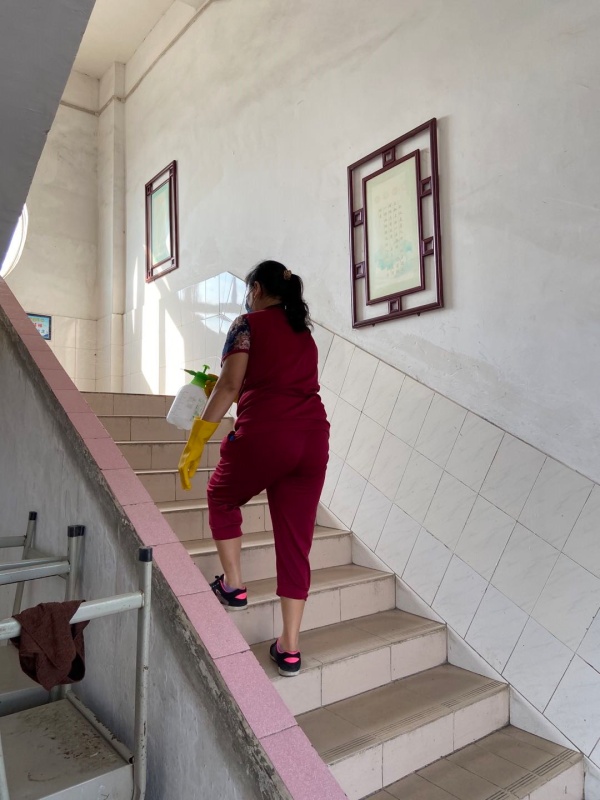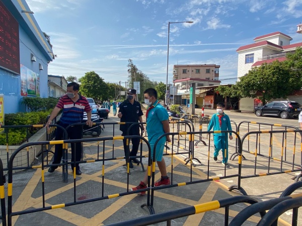 下午3点,演练正式开始,陆锐勋校长为本次演练的总指挥;本次演练分为7个演练内容,第一:早上乘校车演练;乘车学生戴好口罩,学生之间前后保持1米距离排队候车,校车跟车员按顺序为学生测温,体温正常(低于37.3度)才允许乘车。第二:师生进校演练;师生佩戴好口罩,有序地排队,然后依次测温进校。第三:师生课间管理及体育课演练;下课后,学生一律在教室内各自座位上休息,不能走动(上洗手间除外)。上体育课时,学生带好口罩,体育老师到班组织学生按1米距离集队和列队到运动场。上课期间,学生不用戴口罩,一切活动要保持一定距离,不能出现聚集。第四:食堂就餐演练;上午放学后,当班老师组织本班学生排好队戴好口罩向食堂出发,原则上按低年级到高年级顺序安排领餐餐,学生进入饭堂后,按指引取餐,取餐后回到各自的教室座位就餐。第五:午间测温演练;各班班主任手持测温枪,对学生逐一学生测温,跟班老师负责记录。第六:下午乘校车演练;学生戴好口罩,保持距离从各班到饭堂前面按各人指定编号站点集队,集队时不允许交谈。集队完毕后,由校车管理员、校车值日老师和值班行政带学生到校车停泊点上车,学生在行走过程要保持1米距离。第七:放学演练;采取分年级错时放学,全校先在班级进行卫生安全教育,然后由当班老师组织本班学生戴好口罩,在教室外按照安全距离排好队伍,带领学生到指定的区域等候(途中教育学生保持距离,不能牵手)。最后是消毒演练;每节课学生上课后及放学后,保洁员用喷壶或喷雾器开展对学校的楼道、走廊、护栏、洗手间进行消毒。