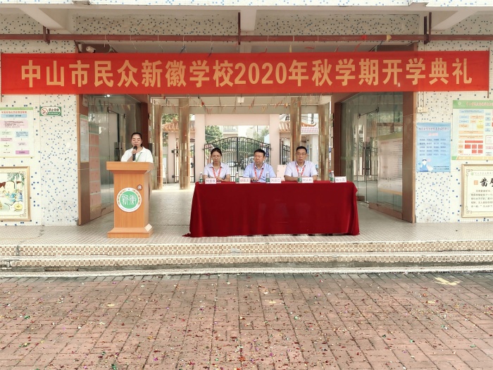 伴着优美旋律的校歌,流光溢彩的礼花,学校办公室主任何景欣宣布中山市民众新徽学校2020年秋学期开学典礼仪式正式开始,拉开了新学期的序幕。