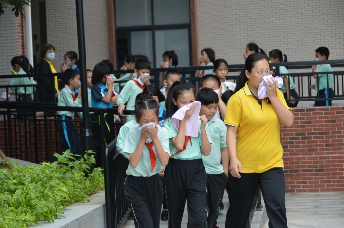 演练前,学校召开了“消防安全疏散演练”培训会。会上,通过观看相关视频、案例,老师们深刻地认识到火灾的危害,直观地了解防火知识以及自护自救技能,掌握遇到火灾正确逃生方法。随着消防警报响起,演练开始,各班主任组织学生疏散,各楼层护导老师们也在第一时间赶到指定区域的楼层拐角、易拥堵处配合疏散学生。学生在老师们的引导下,按照逃生路线,低头弯腰,用衣袖、小毛巾捂鼻,不慌不挤,快速有序地撤离到学校操场。随即各班清点人数,并向演练指挥报告。消防演练有序完成,全校师生全部疏散到达指定安全区域,整个演练活动快速、安全。演练后,李向平校长对演练活动进行了点评和总结,希望师生进一步增强安全意识,熟悉灾害发生时的应对措施,增强安全意识的同时培养自护自救技能。