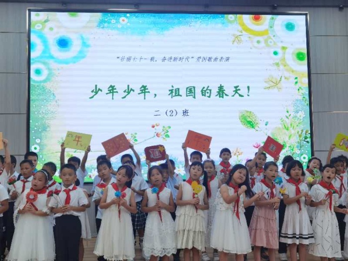 接着,良都小学各年级分别开展以唱红歌、朗诵和演讲为主题的活动。上午,一二年级各班围绕庆祝新中国成立七十一周年或歌颂党、歌颂祖国主题,开展班级合唱比赛。《少年少年,祖国的春天》《团结就是力量》《祖国祖国我爱你》等活泼、充满朝气的歌曲拉开了本次庆国庆系列活动的序幕。