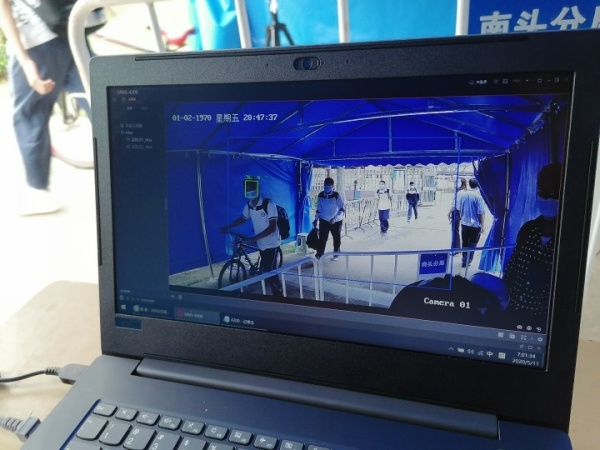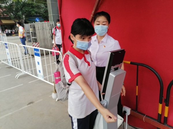 中山市教育和体育局检查组莅临南头镇初级中学检查开学工作。在学校南门,同学们有序地相隔一米,自觉接受体温检测,检测通过后,按照要求停放自行车,回教室安坐。在北门,科技助力学生返校,南头镇初级中学在校门口设置了人体热感测温系统,可实现立马测温让学生快速通过,避免扎堆。