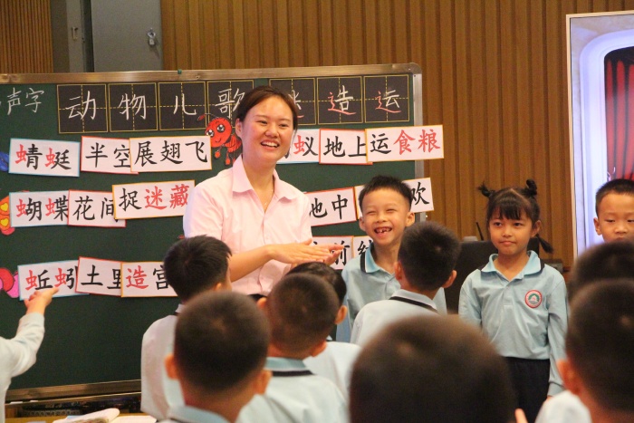 首先,由优秀教师代表兰培老师和106班的同学们带来了一堂生动有趣的识字教学课——《动物儿歌》。这堂课的教学设计紧紧围绕梁老师在本学期教研会上提出的“挤去思维上的水分、挤去课堂模式上的水分、挤去展示上的水分、挤去练习上的水分”这四个要求,以低段识字、写字教学为目标,形式多样,富有童真童趣。