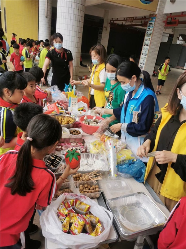 现做美食、扔圈套物、精品文具、零食礼包……同学们、家长义工的角色多变,售货员、收银员、推销员随处可见。各个摊位都使劲浑身解数,招揽一批又一批的小客户。一件件充满爱心的卖品,一张张纯真可爱的笑脸,一声声此起彼伏的吆喝,使整个操场一下子汇成了欢乐的海洋,给春意盎然的校园增添了更多生机和活力。“淘客”们穿梭在义卖校道上,开心地寻找自己心仪的宝贝,其中不乏老师们,为了支持爱心活动的开展,老师们也加入了“淘宝”大军。