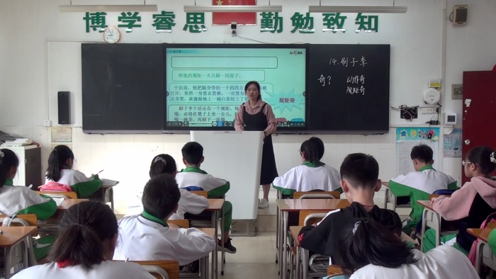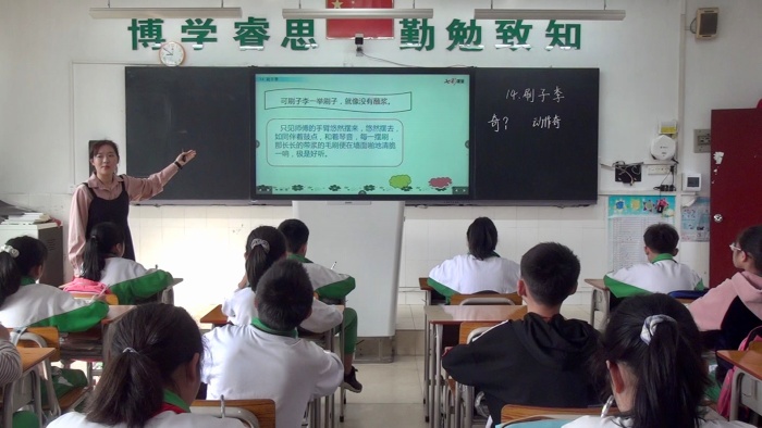 课堂伊始,蔡老师用名片激发学生的学习兴趣,同时利用有趣的肢体动作演示帮助学生理解刷子李刷墙时的动作,引导学生理解他的技艺高超。学生在轻松、有趣的环境中学习《刷子李》这一课,朗朗的书声此起彼伏,课堂氛围十分活跃。