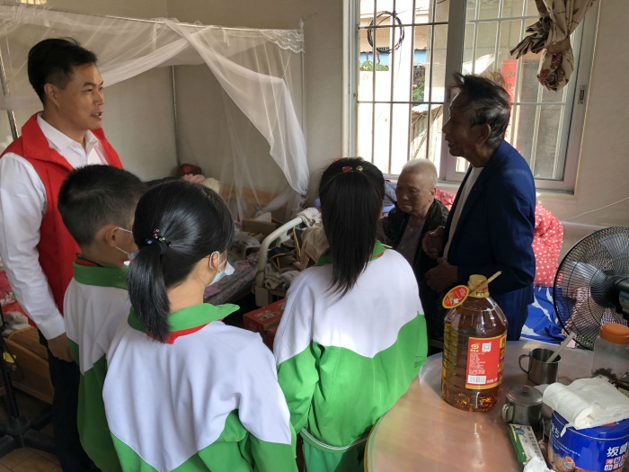 随后在学校少先队大队部的组织下,结民村团支部书记吴飞宝、结民村民政助理杨顺昌、学校吴博事校长、段美娟副校长和大队辅导员周文彪老师,带领少先队志愿者们,走进了老人的家开展了爱心慰问活动。活动中各中队少先队志愿者代表热情地与爷爷奶奶们交谈,给他们送上了面条、花生油和慰问金,并祝愿他们健康长寿。爷爷奶奶们一个个神采奕奕,高兴不已,脸上露出了幸福的笑容。活动在愉快的气氛中顺利结束。