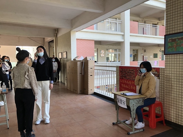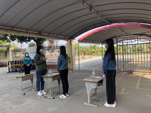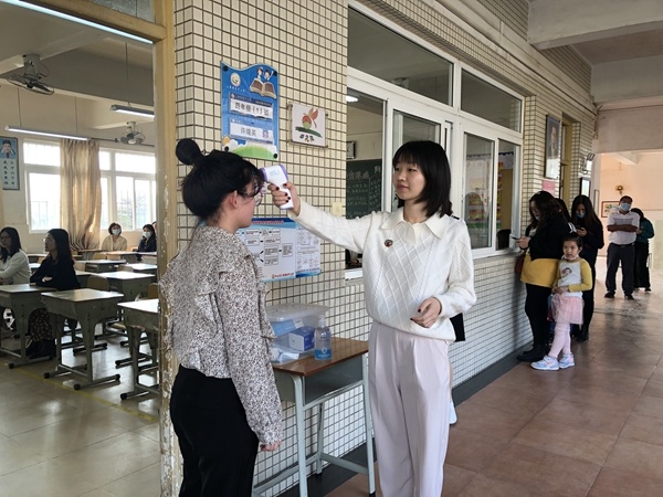 把好入校安全关。参与演练的教师模拟“学生”,在东校门外每人间隔1米站队,依次踏着消毒地毯进入校门,值日老师进行体温测量,喷免洗洗手消毒液消毒双手。对于体温异常的学生,值日老师通知值日行政,值日行政安排学生到临时观察室等候,并通知校医对学生进行水银温度计进行二次测温,询问相关情况。