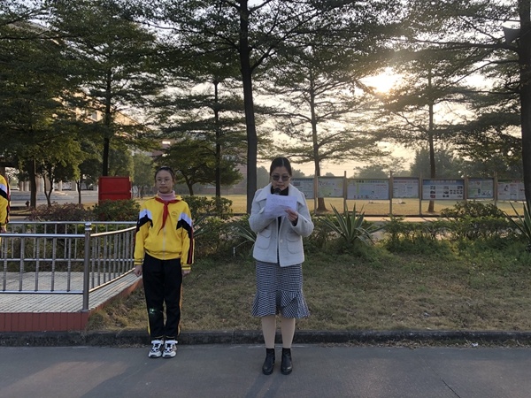 迎着初晨的朝阳,护旗手护送鲜艳的五星红旗,昂首挺胸向旗台走来,高平小学全校师生的目光凝聚在国旗上,唱着国歌,注视五星红旗缓缓升起。紧接着,德育处黄洁玉主任在国旗下进行以“疫情防控与冬季传染病的防护”为主题的演讲,提醒大家虽然在疫情防控方面取得了重大成功,但绝不能掉以轻心。