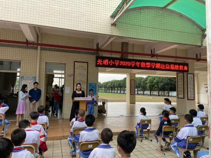 光明小学德育主任林秋影集中全校师生在操场向师生宣传应急避险教育,林主任从提高交通安全意识、如何预防绑架侵害、在家的安全防御知识,如何报警等五个方面对学生进行安全教育,她希望全体师生以此次应急避险教育为契机,牢固树立“安全第一”的意识,保护生命、珍惜生命、热爱生命,提高自己面对突发事件时的应变能力和生存能力,稳步推进“护校安园”的建设。