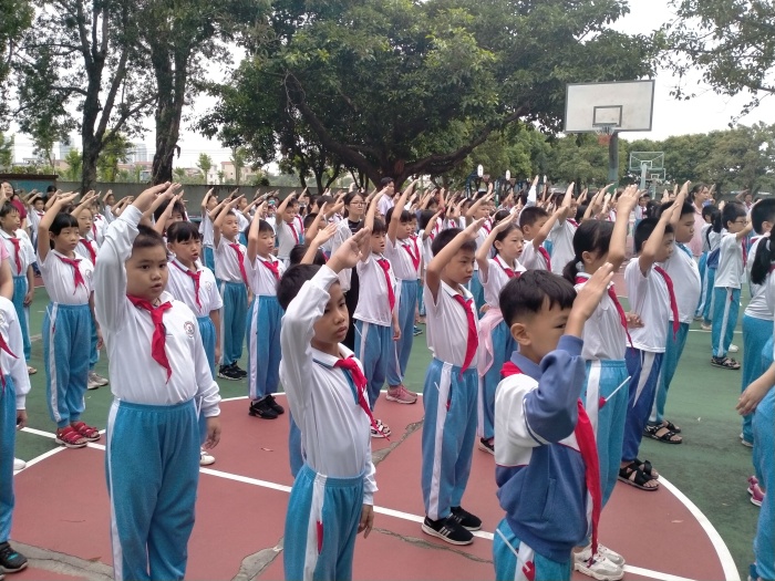 8点30分,主题活动在庄严的升旗仪式中拉开帷幕,整个会场秩序井然,在庄严的国歌声中,鲜艳的五星红旗缓缓升起,全体师生面向国旗肃立,少先队员行队礼,其他同学和老师行注目礼,在心中铭记五星红旗的重要意义。