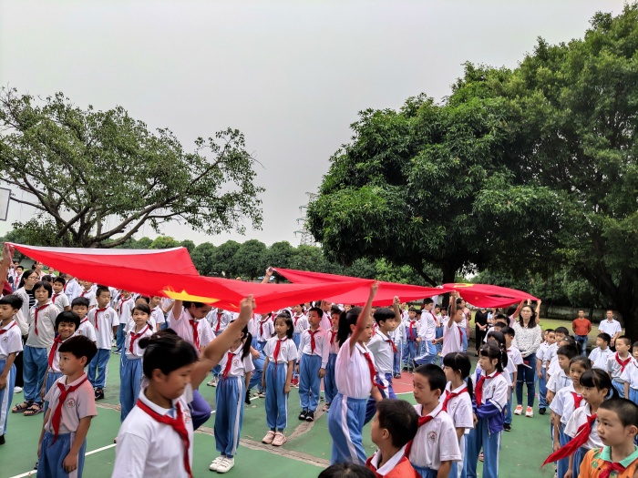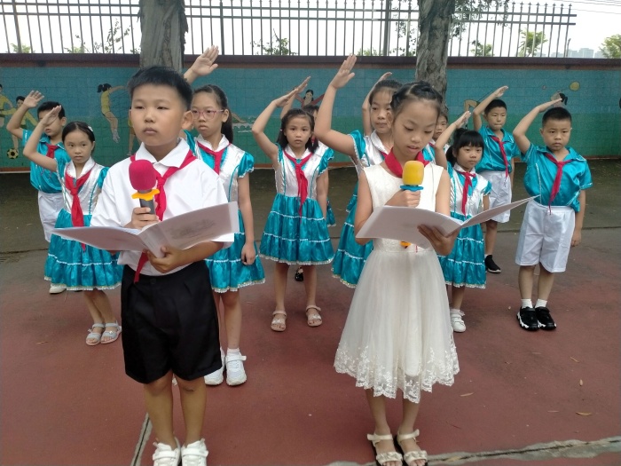 紧接着,学校旗手代表们迈着整齐划一、铿锵有力的步伐,高高举起国旗、党旗和队旗,从学生的队列中庄严走过,全体师生行注目礼。“听党话、感党恩、跟党走”深深地烙在幼小的心灵里。
