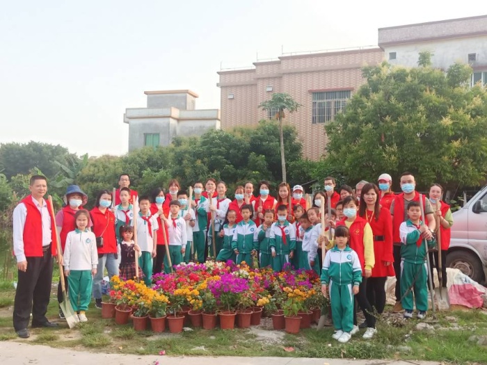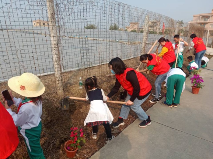 活动当天,在崔焕英校长的亲自带领下,亲子义工们有挖坑的,有扶着树苗的,有填土的,还有提着水桶来回浇水的,打支撑的,干得热火朝天。当中有不少孩子都是第一次参加植树,动作稍显笨拙,但丝毫不影响他们对植树节劳动的积极与热情。家长们手把手地指导,并提示孩子们注意安全。两个多小时过去,在全体亲子义工的努力下,栽种工作顺利完成,共栽植三角梅一百五十余株。轻柔的春风中,看着自己亲手种下的一棵棵小树,畅想着数年以后它们慢慢长大,枝繁叶茂,孩子们脸上露出了灿烂的笑容。