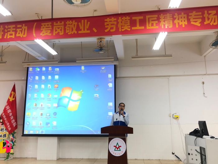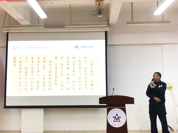 接下来,中山市三角镇供电分局综合部李亮棠主任同样为同学们带来了精彩的宣讲——《我的工匠精神》。李亮棠主任作为土生土长的三角人,在参加工作以来不断实践,不断创新,开启了另一片广阔的天空,在2018年被评为“中山好人”。他是群众口中亲切的“棠哥”,是电气领域出色的“安全卫士”。以李主任为首的创新工作室经过多年研究,发明了多项创新成果并成功申请了多项国家专利。李亮棠主任将这些成就都归功于“工匠精神”,他表示:工匠精神是一种职业精神,它是职业道德、职业能力、职业品质的体现,其内涵包括敬业、精益、专注、创新等方面的内容。自己也不断要求自己贯彻习近平总书记关于雷锋精神中“要不断发扬干一行爱一行,专一行精一行的敬业精神”的论述,完成自己的工匠精神提升之路。