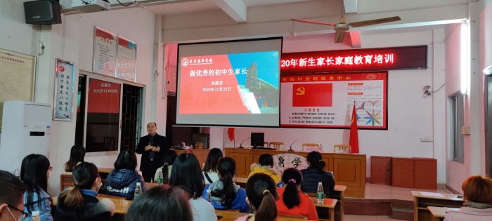 为加强学校与家长的交流,整合家庭和学校两部分的合力,提高学生教育成效,12月23日晚上19点,三角中学在东南村党群服务中心举行2020年新生家长教育培训,初一年级新生家长参加了培训。