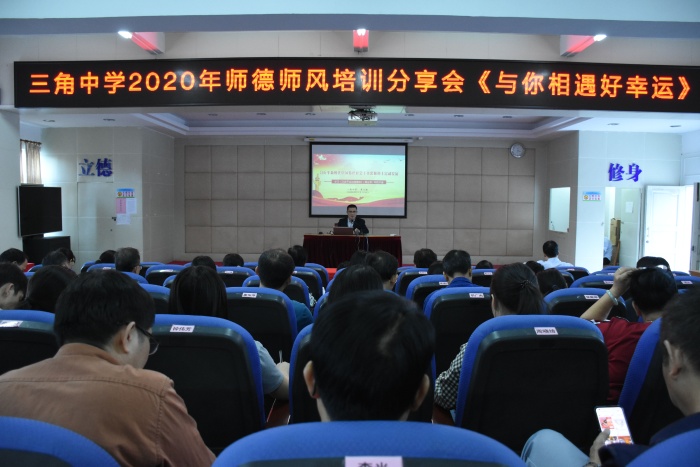 为了进一步加强师德师风建设,提高教职工的职业道德素养,强化教师文明从教、规范从教的职业意识,11月12日,三角中学在学校报告厅召开师德师风建设专题教育会。本次会议由德育处覃子湘主任主持,全校教职工参加了此次会议。会议中,覃子湘主任做题为《与你相遇好幸运》的师德专题讲座。