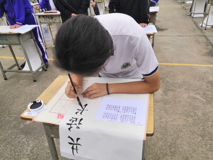 来自初一、初二两个年级的一百多名选手来到操场比赛场地。在主持人卢富生副主任宣布比赛主题、规则,介绍完出席活动的领导之后,比赛正式开始。现场气氛十分活跃,同学们全力投入,精心书写。他们握笔正确,书写认真,横竖撇捺,起笔收笔都洋溢着热情,挥洒着灵感,一幅幅书法作品,令人欣慰,令人赞叹!