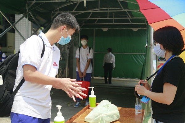 根据上级指引,博爱中学初三学生从中午12:20开始,实行分五批次错峰返校。中午12:20,值日教师组织学生在校门口排队,保持1米的间隔距离,依次有序进入体温检测通道。在测温区,值日教师在通道两侧通过红外测温仪和手持测温仪对学生逐个进行体温检测,体温正常的学生使用免洗洗手液清洁手部后进入校园。学生进校后按照指定路线回到相应班级。由班主任再次测量体温,方可进入课室。