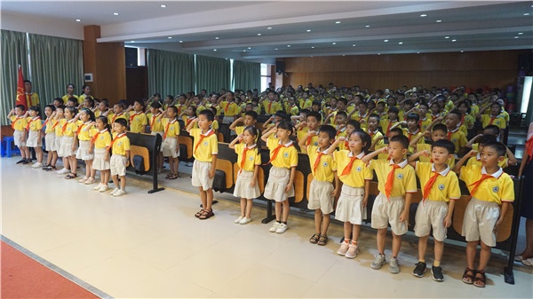 为迎接这次入队仪式的到来,一年级各中队提前开展了队前教育,观看队知识视频、学习队歌、填写入队申请书……帮助新队员们树立“红领巾小主人”意识。7月10日上午8点,一年级同学穿着整齐的校服,踏着坚定的步伐有序地来到阶梯室,等待着他们人生中第一次意义非凡、激动人心的时刻——加入光荣的中国少年先锋队组织。