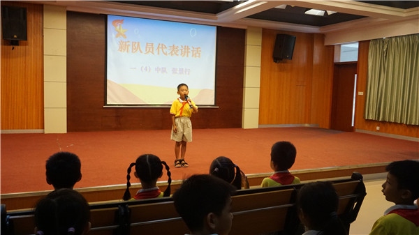 庄严宣誓后,一(4)中队的张景行队员作为新队员代表发言,他表达了无比愉悦的心情和积极向上的决心。学校少工委大队辅导员钟老师为各个中队授中队旗;德育主任谢万明主任为一年级各中队的中队辅导员颁发聘书,看着鲜艳的红领巾和矗立的中队旗,新队员们异常兴奋,全场响起了热烈的鼓掌声和呐喊声。