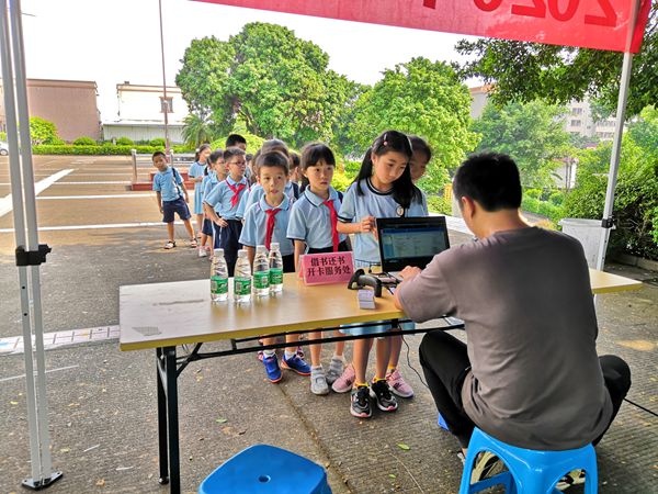这是在做什么?原来是沙溪镇中心小学为增强学生的阅读兴趣,增加阅读量,提高阅读技能,便结合中山纪念图书馆的流动图书服务,开展“流动图书进校园”活动,以读书活动为契机,引领和推动学校读书活动的开展,形成读书氛围,推动书香校园建设。本次活动在学校副校长刘美霞和语文科组长刘绮云老师的安排指挥下分年级有序地开展。活动现场工作人员在为学生介绍图书借阅流程的同时,耐心讲解流动图书服务,并现场为有需要的学生办理读者证。对这一崭新的阅读形式,学生们兴致高昂,迫不及待地选择自己喜欢的图书,津津有味地读起来。活动结束后,学生们依依不舍地把书放回原位置,意犹未尽。已办理读者证的同学则兴高采烈地办理好借阅手续,带着心爱的图书回家继续遨游书海。