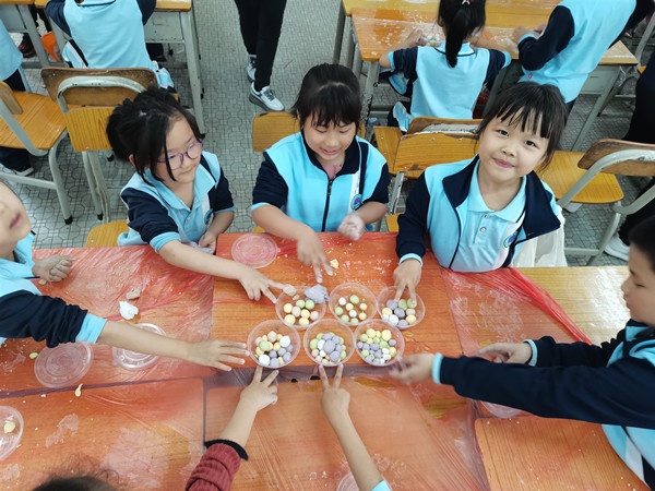 品尝完美味的汤圆,各班开展动手制作做汤圆活动。同学们兴趣盎然,三个一组,五人一群,围在一起,在义工家长的指导下,和面粉,揉捏面团,在面团里包各种各样准备好的馅料。同学们都说,包汤圆真好玩,一定要把自己包的汤圆带回家,与家人一起分享。