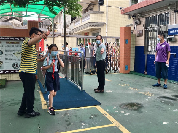 龙头环学校严格执行上级规定,一切以确保学生人身安全与身心健康为前提,把控好学生返校后校园学习生活的每一个环节。早上,天色尚不明朗,龙头环学校的教师们早已回到学校并站到指定的岗位,吴发志校长到校门口迎接学子们并指挥大家按规定有序进入校园。家长义工们在校园门口协助学生按照间隔不少于一米的距离排队进校,网格管理教师和驻校医生在旁边随时候命,所有学生在通过人脸识别测温系统进入校园后,还必须进行洗手、足部消毒等环节,整个入校过程安静迅速,整齐有序。