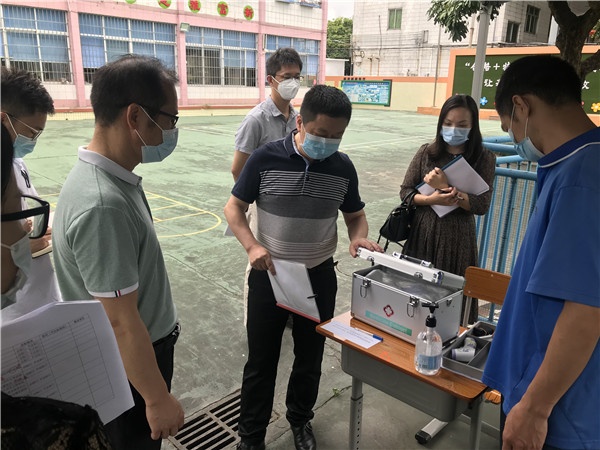 检查组一行听取了吴发志校长关于疫情防控和复学准备工作的汇报,详细查看了相关资料,实地查看了校园体温检测点、防控物质储备室、防控隔离室、卫生防疫消毒、办公教学等区域,并详情了解学校师生健康体质监测、防疫物资准备、学生晨午检、分餐安排、防控应急预案等工作落实情况。另外,检查组一行在学校会议室详细了解了学校各项防疫工作流程和预案,查阅了相关复学准备工作台账资料。