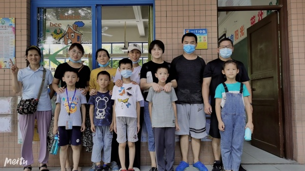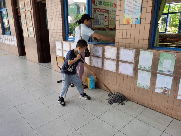 7月12日上午,第三批志愿者——部分亲子义工队成员回到学校进行教室清扫大会战。