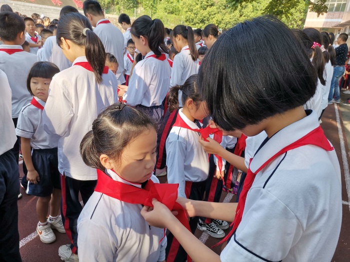 活动当天,迎着灿烂的阳光,伴随着《红领巾飘起来》的歌声,五、六年级的老队员庄重地为二年级新队员佩戴红领巾,互敬队礼。鲜红的队旗见证了这一光荣的时刻。全校师生祝贺二年级小朋友成为了一名真正的少先队员。仪式上,大队辅导员授予新辅导员中队旗,对新少先队员,提出了新希望:牢记和践行习近平总书记“从小学习做人、从小学习立志、从小学习创造”“立志向、有梦想,爱学习、爱劳动、爱祖国”。