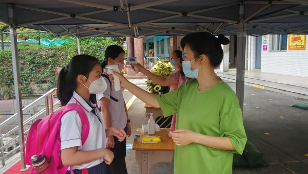 沐浴着五月的春光,经过漫长的等待、紧密而认真的复学准备后,5月18日,厚兴郑伟权学校的校园又开启了“重启键”,四-六年级的学子迎来了复学后别样的“开学第一课”。学校认真做好每一个环节,上午7:10,行政和值日老师们早早在校门执勤等候,四至六年级的学生,在老师的引导下,戴好口罩,间隔一米距离,体温检测无异常后有序进校复学。