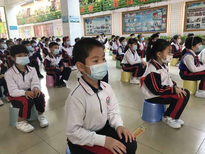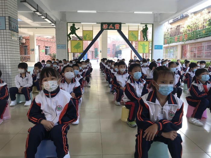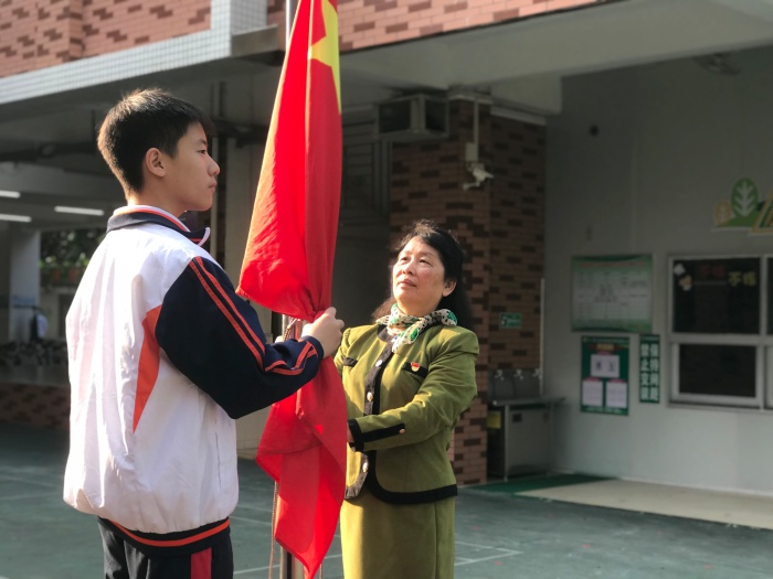 由于疫情还在防控期,开学典礼分会场和课室两个场地进行。新学期的第一面国旗由大家敬重和爱戴的董少仪老师升起。董少仪老师是该校的退休教师,董老师是一位热爱工作、热爱生活并且爱生如子的好老师,退休后董老师一直发挥着自己的余热,热心退休教师党支部工作。是该校全体师生学习的榜样!